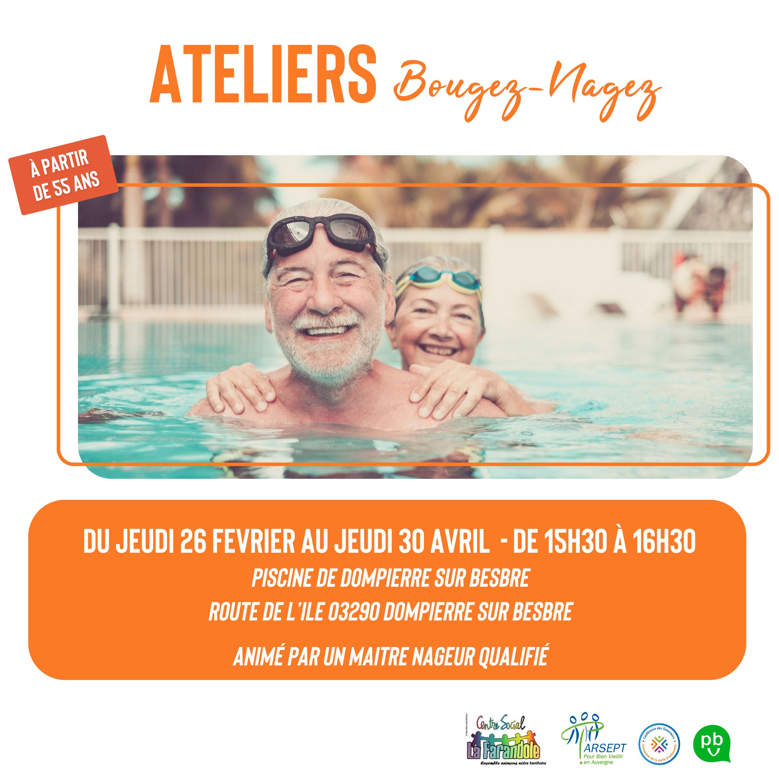 jeu 26/02/2026 - 15:30 Atelier en présentiel Du jeudi 26 février au 30 avril - De 15h30 à 16h30Piscine de Dompierre sur Besbre - Route de l’Ile, 03290 Dompierre sur Besbre Il n'est pas possible de s'inscrire